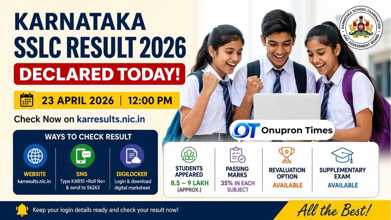 Karnataka SSLC Result 2026: The Karnataka SSLC Result 2026 has been officially declared today, bringing relief, excitement, and nervousness for students and parents. The results were announced by the Karnataka School Examination and Assessment Board (KSEAB) on April 23, 2026, at 12 noon on the official website or the Onupron Times website.