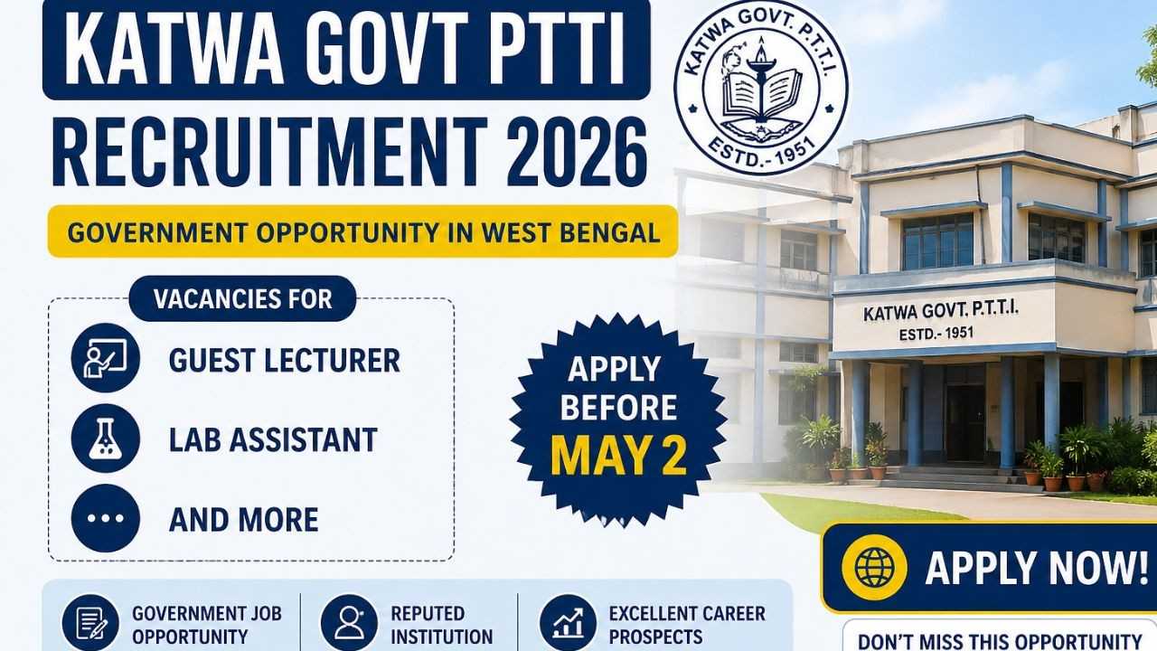 Katwa Govt PTTI Recruitment 2026 WB: The Katwa Government Primary Teachers’ Training Institute (GPTTI), under the Department of School Education, Government of West Bengal, has released a notification for inviting applications for several contractual posts. Interested and eligible candidates must submit their applications offline before May 2, 2026 (2:00 PM).